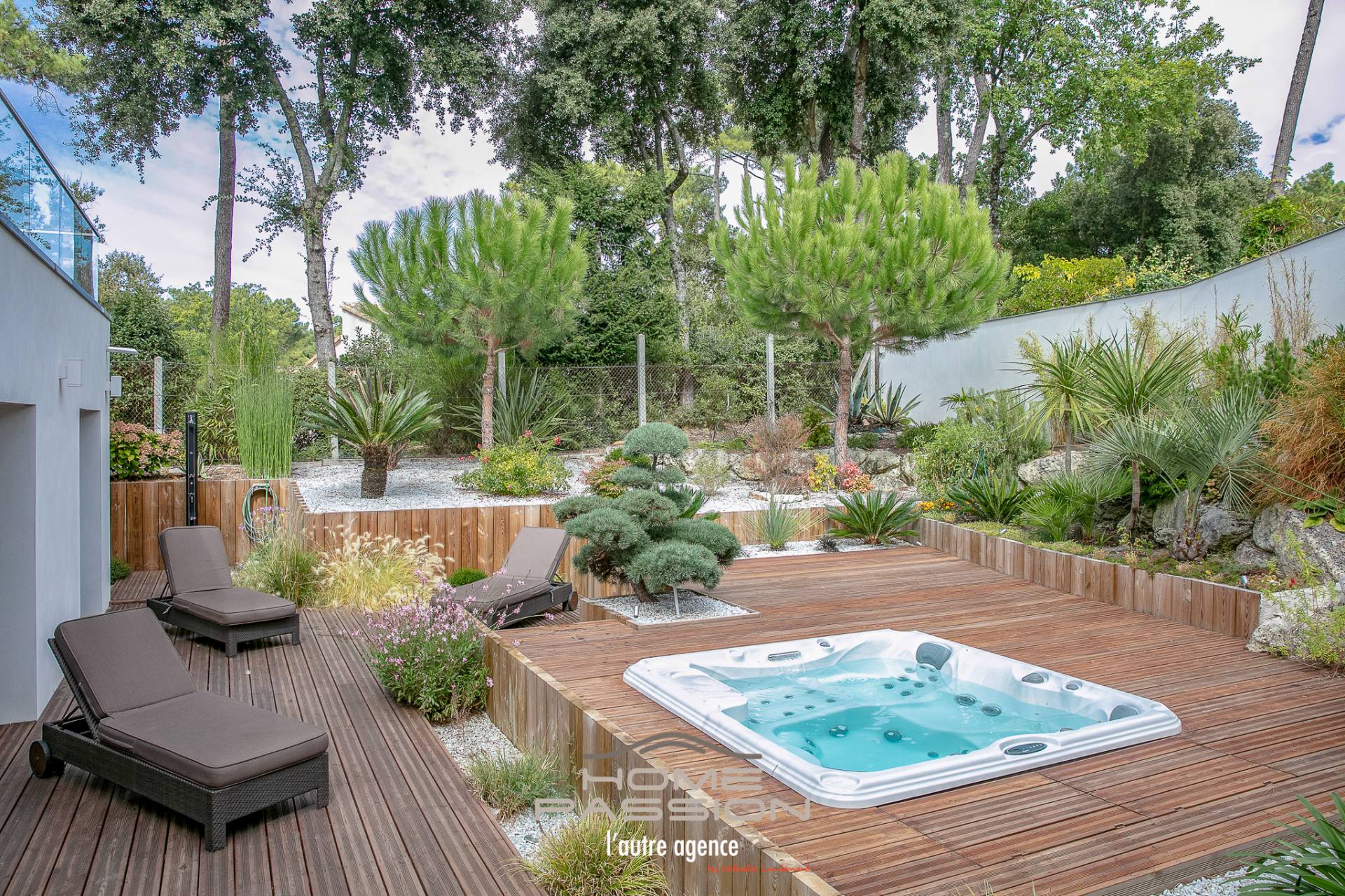 SAINT GEORGES DE DIDONNE SPLENDIDE VILLA CONTEMPORAINE - Située à 260m de la plage et à 1400m du centre ville de SAINT GEORGES DE DIDONNE, Home Passion vous présente cette splendide VILLA métamorphosée et rénovée il y a peu, développant ainsi 220m2 habitables sur un terrain clos et superbement paysager de 700m2. Afin de profiter d'une lumière traversante optimale, les volumes principaux ont trouvé leur place au premier niveau de la VILLA pour nous présenter un hall d'entrée très fonctionnel, une réception avec cheminée, une cuisine ouverte entièrement équipée, l'ensemble ouvrant sur les différentes terrasses et loggia au levant comme au couchant. WC invités également sur ce niveau. Un second salon détente TV, le bureau et les espaces nuit se répartissent les volumes du rez-de-chaussée autour d'un jardin intérieur dont une suite parentale avec dressing et salle d'eau privative, 2 autres chambres avec une salle d'eau , WC indépendant, chacune des chambres ouvrant sur jardin et/ou une terrasse. Une buanderie et un garage double complètent le rez-de-chaussée. Le 2ème niveau réserve une belle surprise par la présence de la suite propriétaire de près de 30m2 avec une magnifique salle de bain, dressing et rangements, l'ensemble ouvrant sur une terrasse à ciel ouvert de plus de 30m2 avec APERCU MER. Côté jardin, le volet paysager a été travaillé et réfléchi pour créer des espaces harmonieux autour du jacuzzi et des terrasses, jardin en espalier avec cascade selon l'humeur. Plus de détails sur le site de l'agence HOME PASSION. DONT honoraires 2.16 % à la charge de l'ACQUEREUR. DPE ancienne version : montant estimé et indexé au 15 août 2015 des dépenses annuelles d'énergie pour un usage standard : 1547 Les informations sur les risques auxquels ce bien est exposé sont disponibles sur le site Géorisques : www.georisques.gouv.fr.