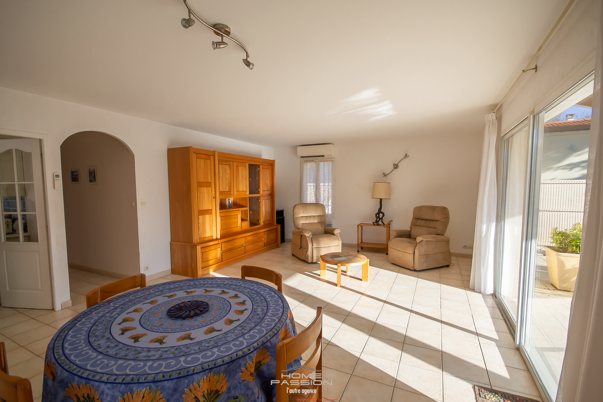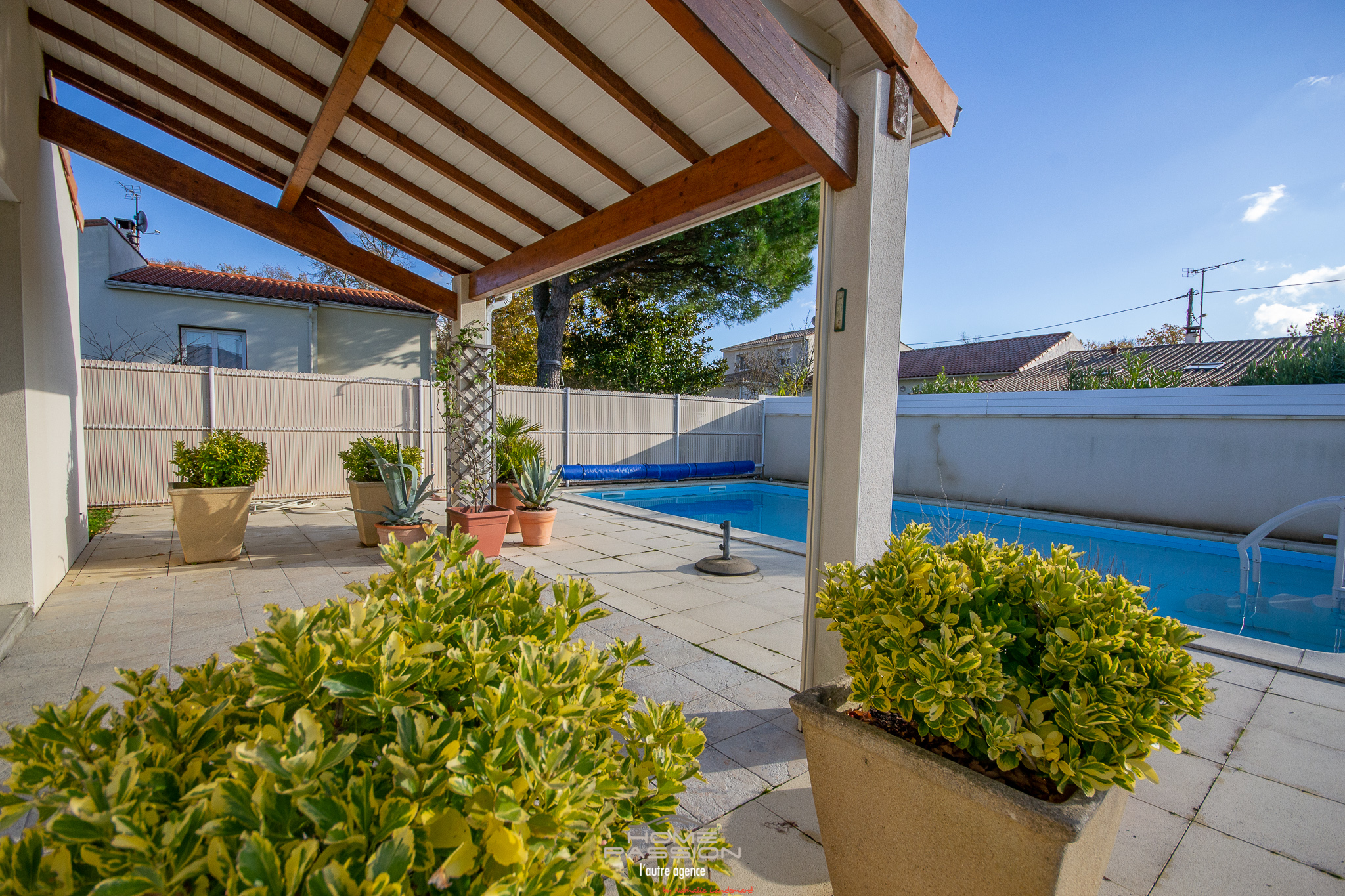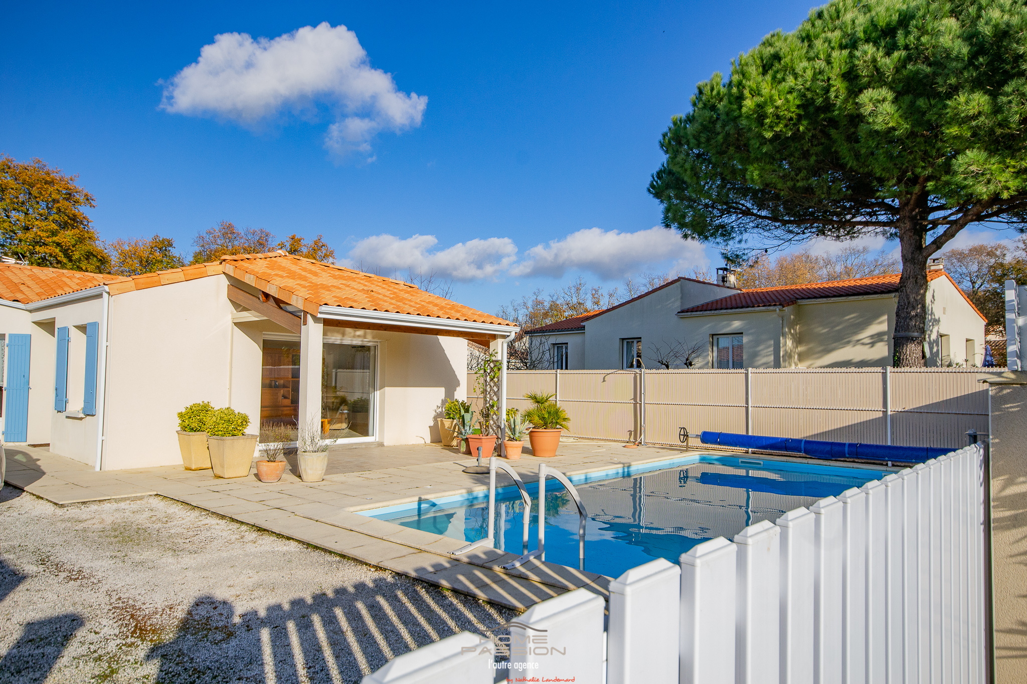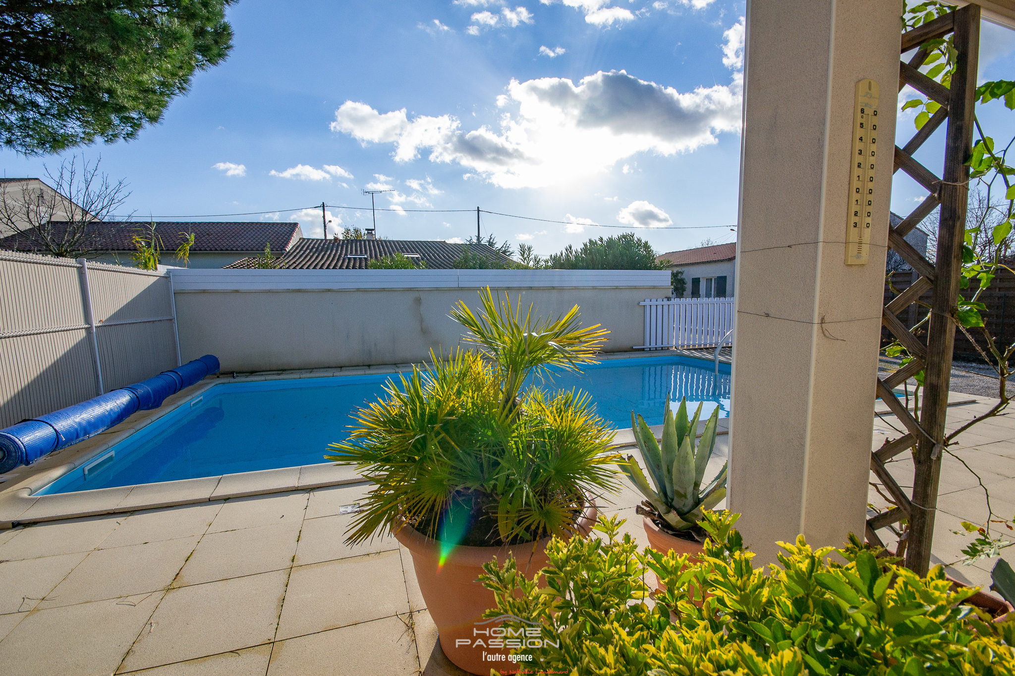 ST GEORGES DE DIDONNE - MAISON DE PLAIN PIED AVEC PISCINE - Située à 550m des commerces et à 1400m de la plage, Home Passion vous présente cette maison de plain pied de 90m2 habitables en type 4 avec PISCINE sur un terrain clos de 445 m2. Au calme et dans un cadre verdoyant, avec un accès en indivision en 2ème ligne depuis la rue, vous profiterez de cette maison bien exposée qui comprend une pièce de vie de 32m2 climatisée, une cuisine indépendante équipée, 3 chambres dont une climatisée, une salle de bain avec baignoire et douche, WC indépendant. Garage attenant. Côté jardin, la piscine est idéalement exposée, terrasse couverte et aire de stationnement pour 2-3 véhicules. Plus de photos, plus de détails sur le site de l'agence Home Passion. DONT honoraires 3,94% à la charge de l'acquéreur.