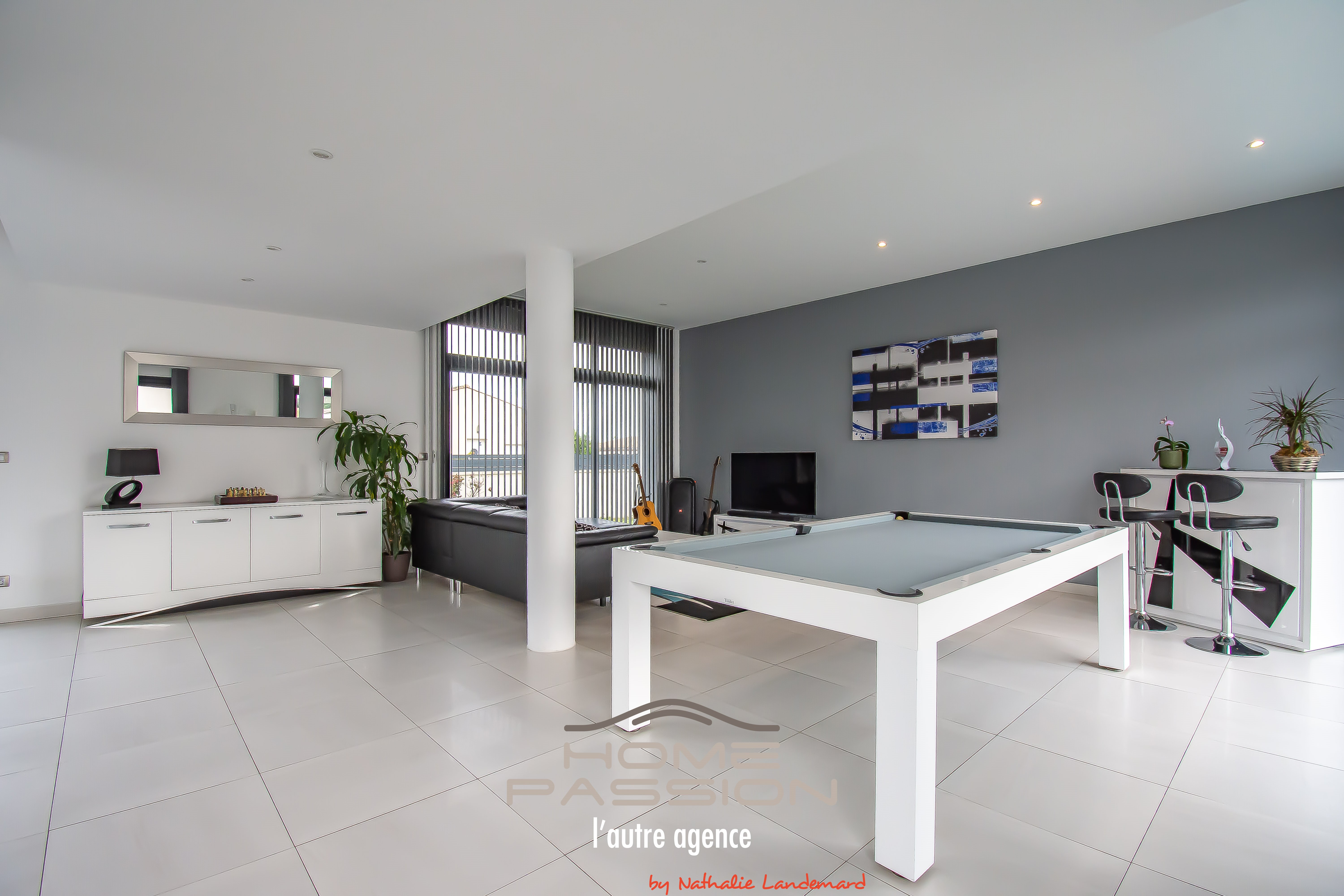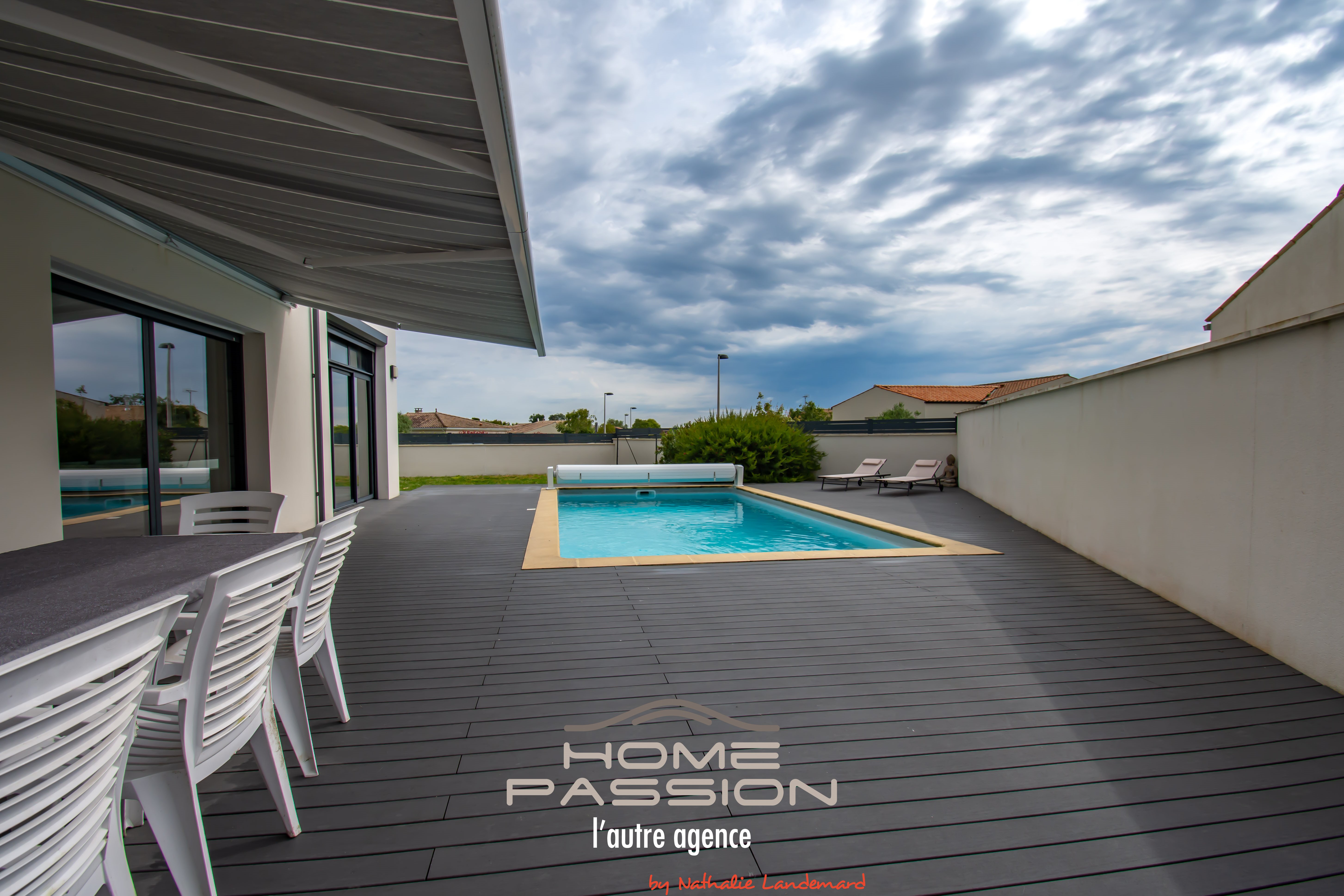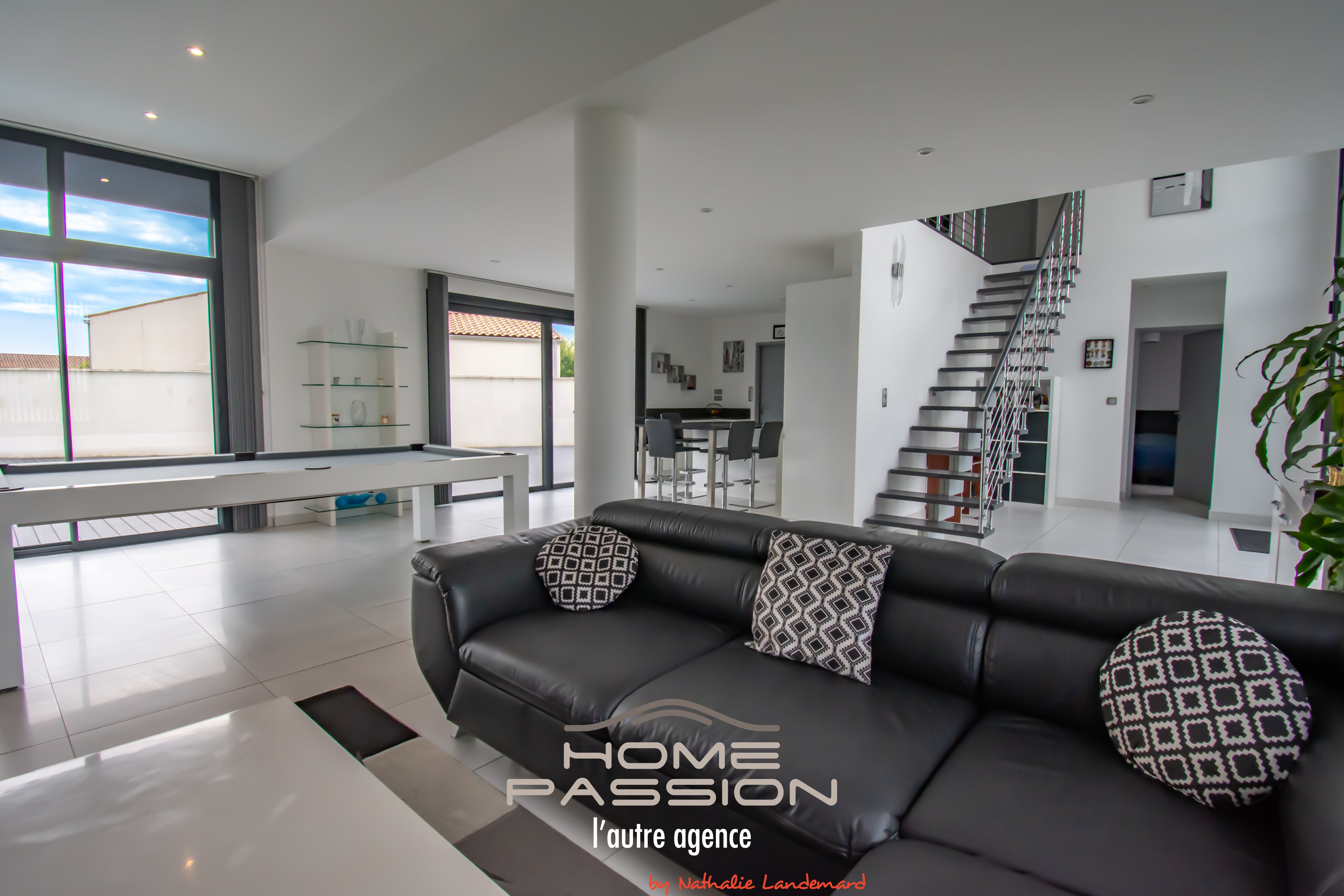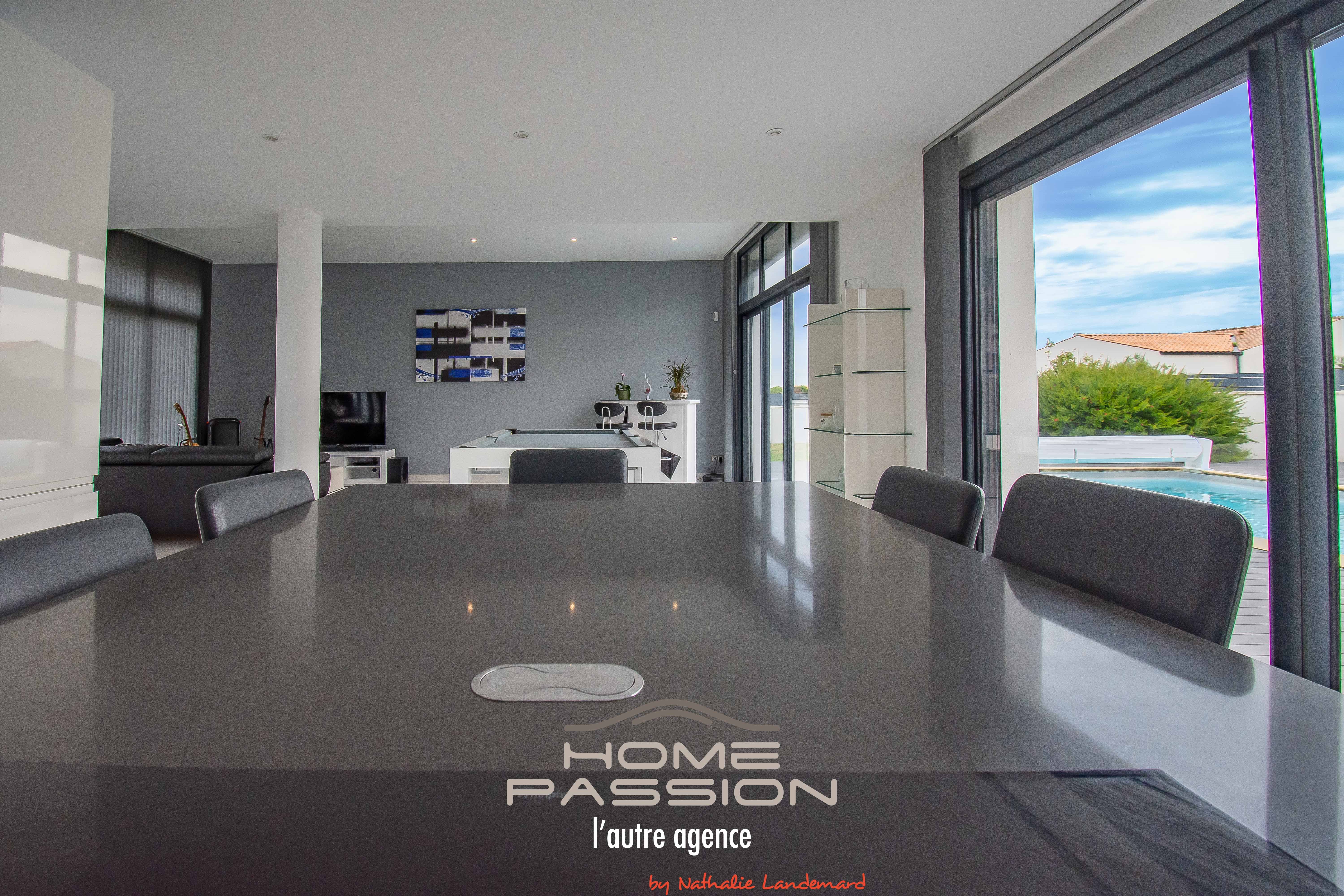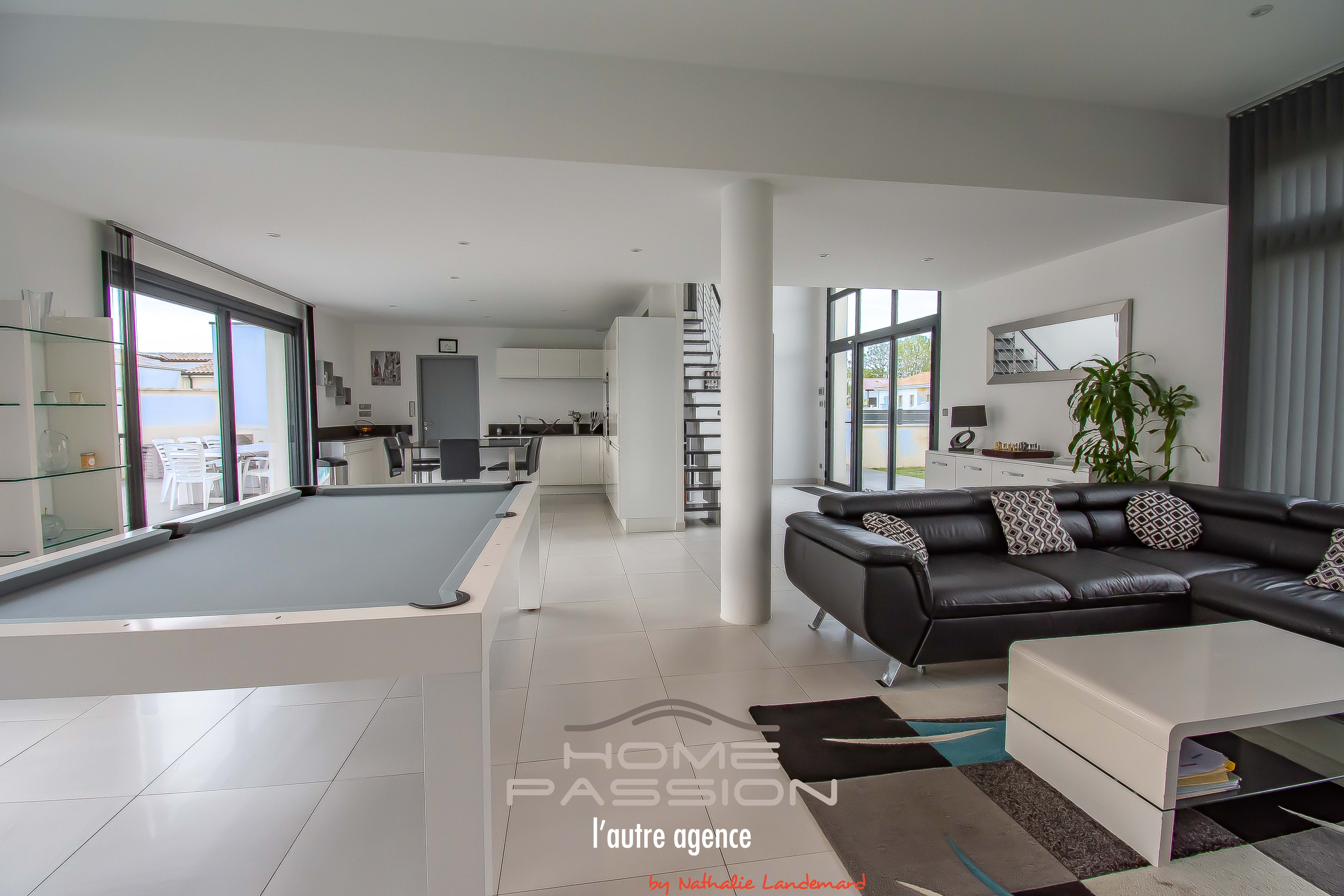 SEMUSSAC - MAISON CONTEMPORAINE AVEC PISCINE EXCLUSIVITE Découvrez cette magnifique maison contemporaine située à Semussac, à seulement 600 mètres du centre-ville et des commerces. Conçue en 2016, cette demeure allie modernité et confort sur une surface habitable de 179 m², le tout implanté sur un terrain de 568 m². Dès l'entrée, vous serez séduit par un vaste séjour de 48 m² baigné de lumière grâce à ses grandes baies vitrées donnant sur la piscine. Cette pièce de vie offre également une hauteur sous plafond de 3 mètres, un conduit de cheminée, et même un billard sur mesure transformable en table pour 12 couverts. La cuisine, aménagée et équipée, est un véritable espace convivial avec son îlot central et son accès direct à la terrasse. Pour votre confort, un cellier/buanderie de 9 m² est également disponible, comprenant des branchements pour une machine à laver, un adoucisseur d'eau, et un ballon d'eau chaude thermodynamique. Au rez-de-chaussée, la suite parentale de 13 m², avec vue sur le jardin, dispose d'un dressing et d'une salle d'eau privative équipée d'une vasque et d'un sèche-serviette. Deux autres chambres à l'étage, chacune de 14 m², bénéficient de placards et de la climatisation réversible, tandis qu'une troisième chambre de 14 m² offre une vue sur la piscine. Une salle de bain avec baignoire et douche, ainsi qu'un bureau de 15 m² en mezzanine, complètent l'étage. La maison dispose également d'un grand garage de 42 m² avec porte sectionnelle motorisée et accès direct à la terrasse, ainsi que de nombreux équipements modernes tels que des volets roulants électriques, une alarme, un interphone, un vidéophone, et une domotique téléphonique. L'extérieur n'est pas en reste avec une piscine de 8x4 mètres, filtrée au sel, et équipée d'un rideau électrique et d'un électrolyseur. La terrasse, équipée de stores bannes de 10m de long, est idéale pour profiter des belles journées ensoleillées,. Cette maison, au style contemporain et aux prestations haut de gamme, est prête à accueillir ses nouveaux propriétaires en quête de confort et de modernité. Plus de photos, plus de détails sur le site de l'agence Home Passion. Dont honoraires 3.94% à la charge de l'acquéreur. DPE : montant estimé des dépenses annuelles d'énergie de ce logement pour un usage standard est compris entre 680 € et 950 €. 2021 étant l'année de référence des prix de l'énergie utilisés pour établir cette estimation. Les informations sur les risques auxquels ce bien est exposé sont disponibles sur le site Géorisques : www.georisques.gouv.fr.
