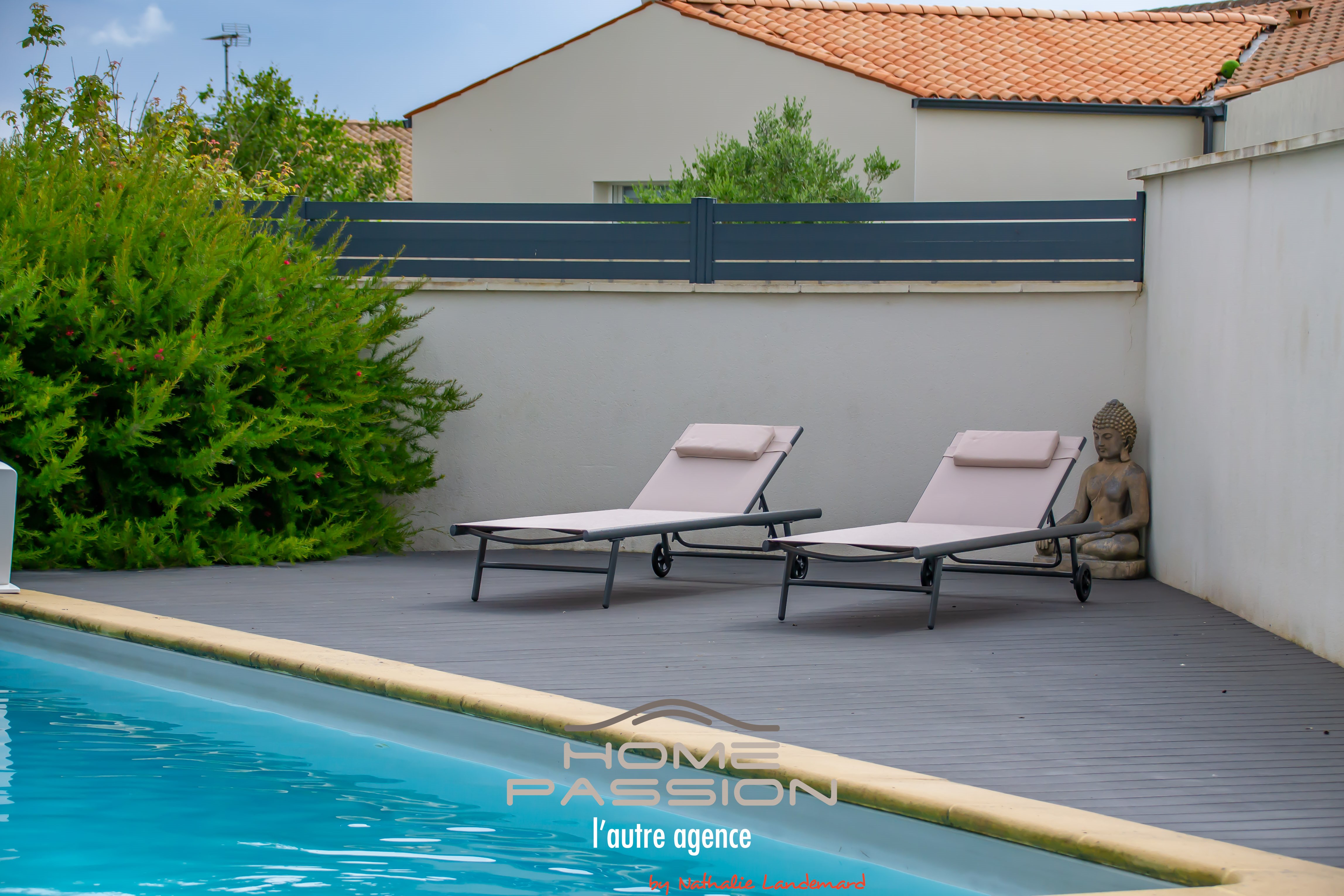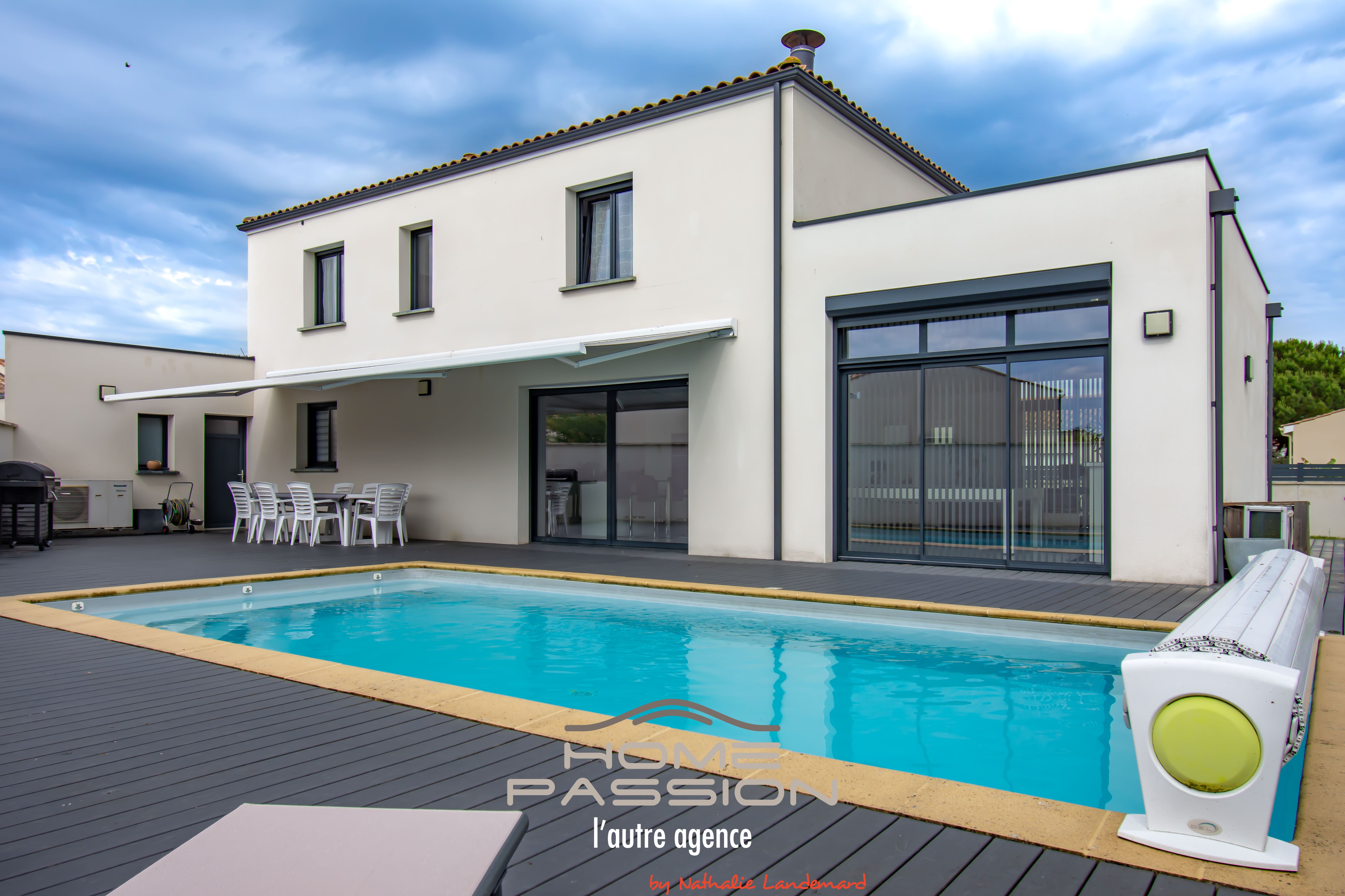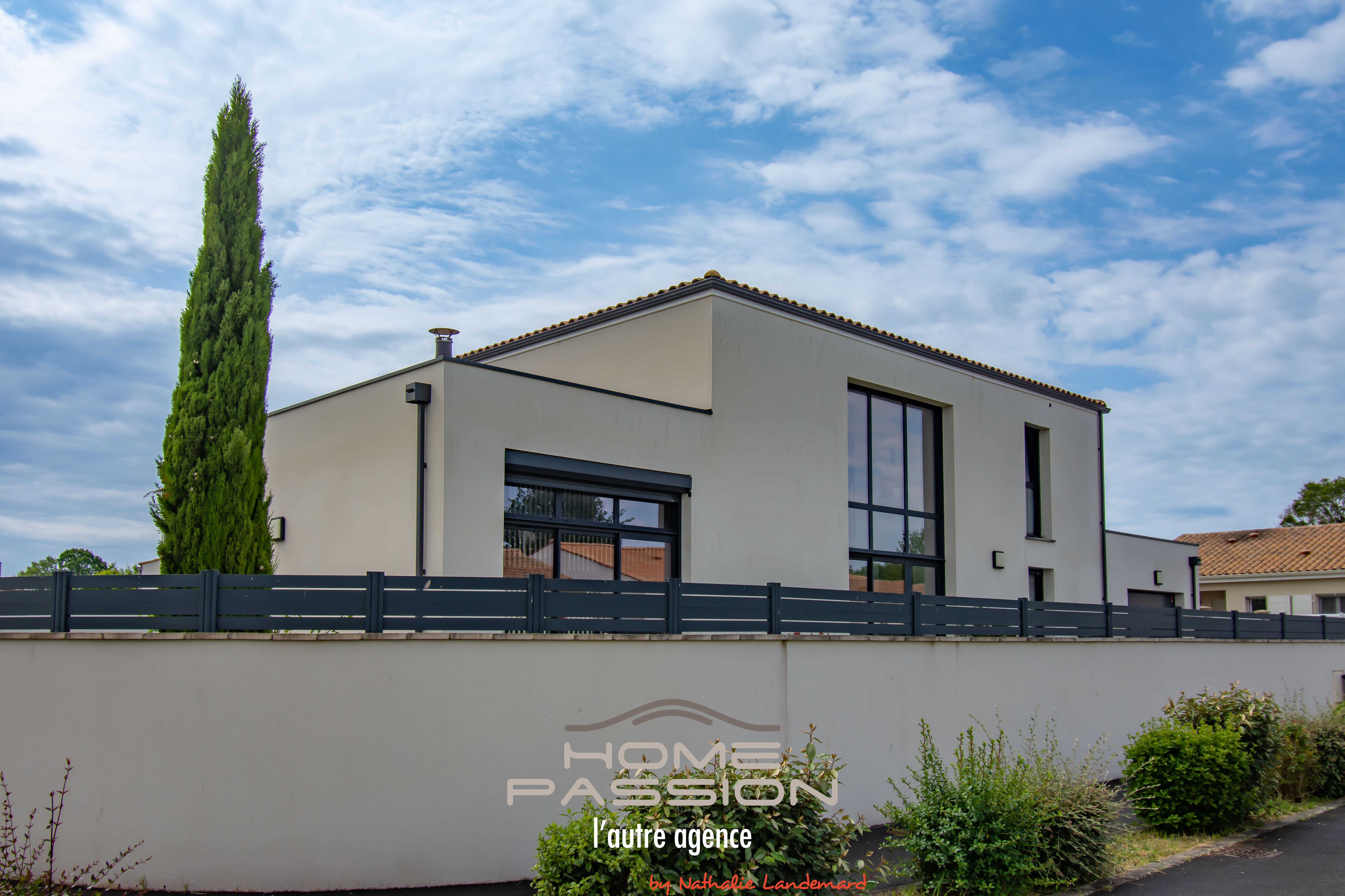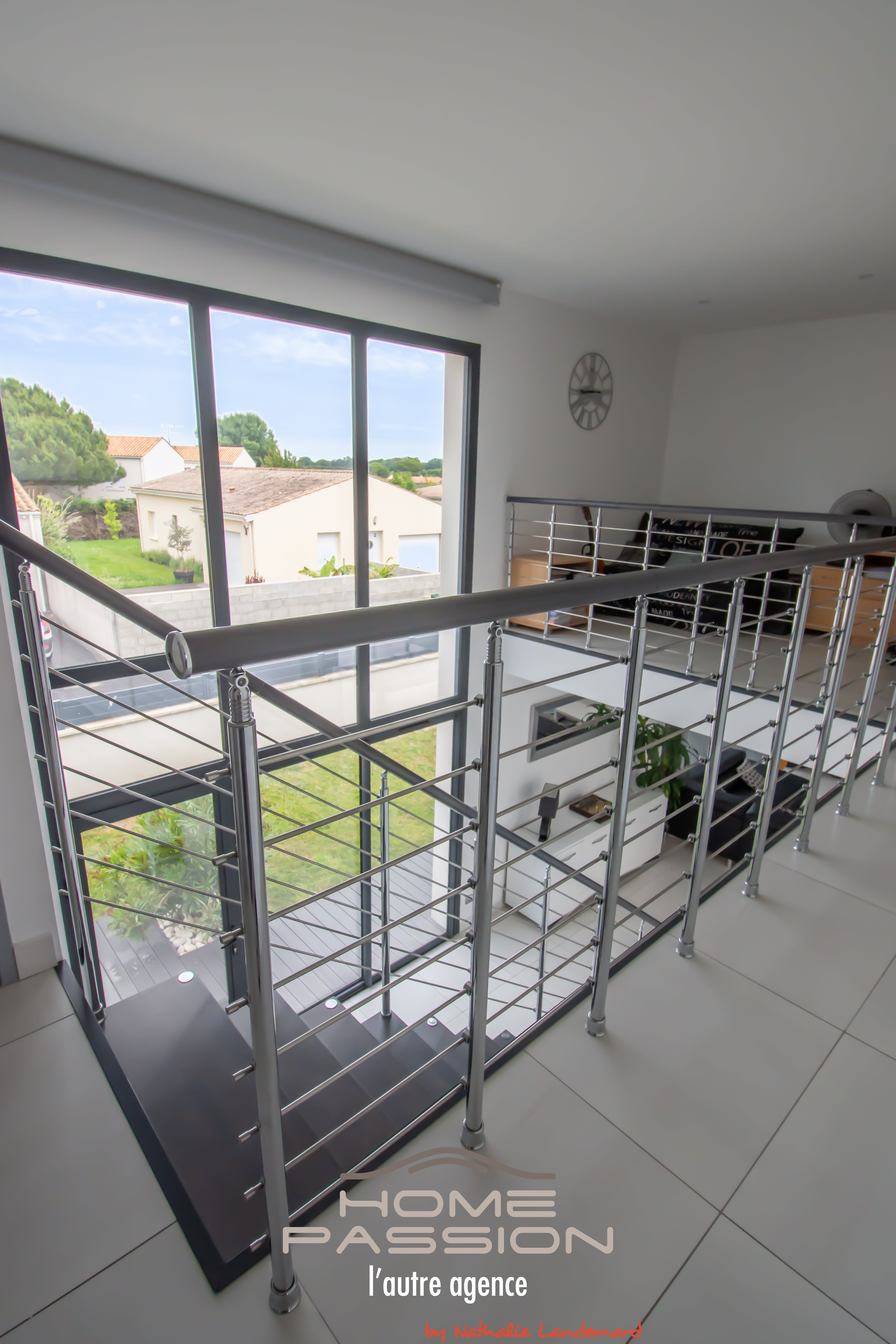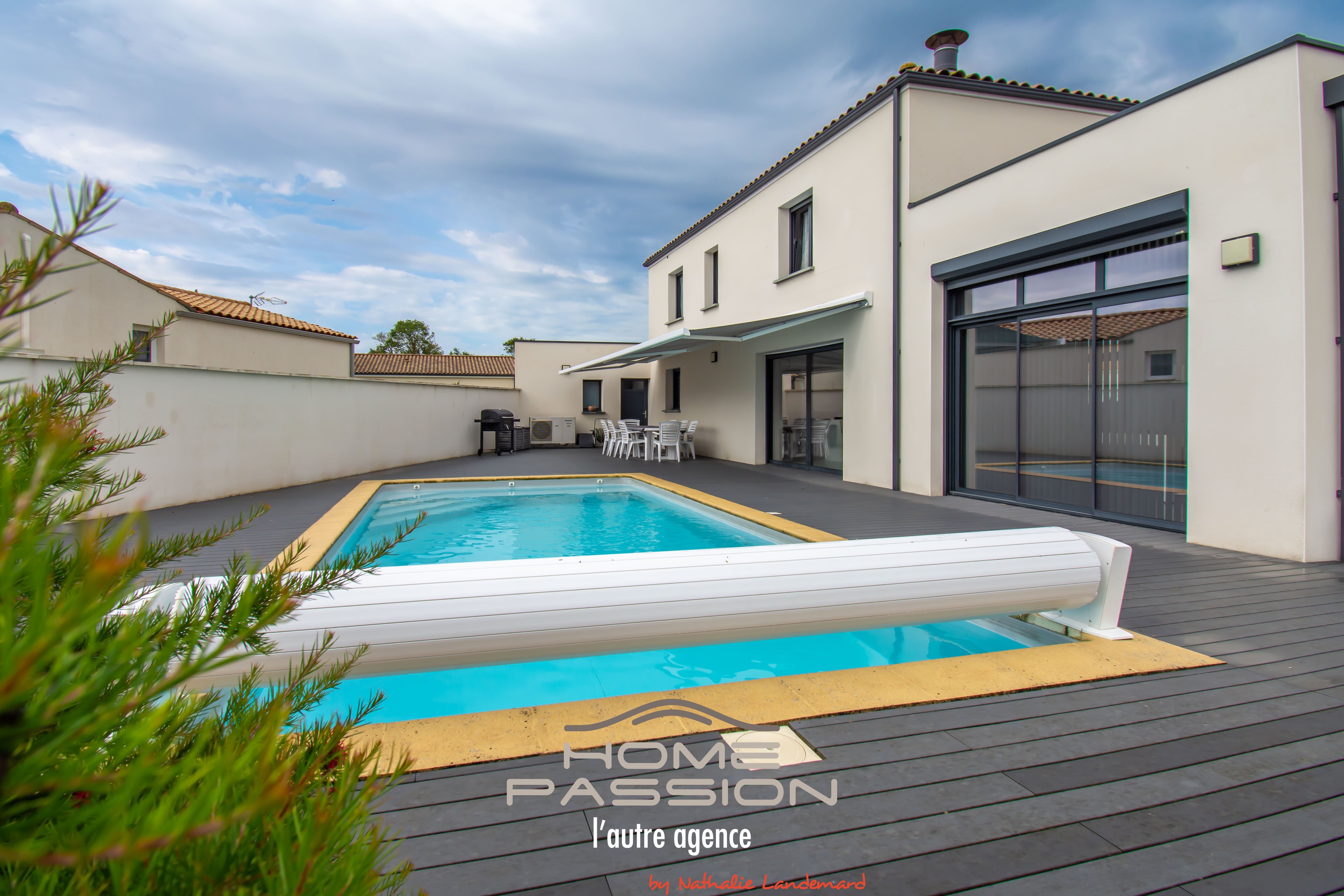 SEMUSSAC - MAISON CONTEMPORAINE AVEC PISCINE EXCLUSIVITE Découvrez cette magnifique maison contemporaine située à Semussac, à seulement 600 mètres du centre-ville et des commerces. Conçue en 2016, cette demeure allie modernité et confort sur une surface habitable de 179 m², le tout implanté sur un terrain de 568 m². Dès l'entrée, vous serez séduit par un vaste séjour de 48 m² baigné de lumière grâce à ses grandes baies vitrées donnant sur la piscine. Cette pièce de vie offre également une hauteur sous plafond de 3 mètres, un conduit de cheminée, et même un billard sur mesure transformable en table pour 12 couverts. La cuisine, aménagée et équipée, est un véritable espace convivial avec son îlot central et son accès direct à la terrasse. Pour votre confort, un cellier/buanderie de 9 m² est également disponible, comprenant des branchements pour une machine à laver, un adoucisseur d'eau, et un ballon d'eau chaude thermodynamique. Au rez-de-chaussée, la suite parentale de 13 m², avec vue sur le jardin, dispose d'un dressing et d'une salle d'eau privative équipée d'une vasque et d'un sèche-serviette. Deux autres chambres à l'étage, chacune de 14 m², bénéficient de placards et de la climatisation réversible, tandis qu'une troisième chambre de 14 m² offre une vue sur la piscine. Une salle de bain avec baignoire et douche, ainsi qu'un bureau de 15 m² en mezzanine, complètent l'étage. La maison dispose également d'un grand garage de 42 m² avec porte sectionnelle motorisée et accès direct à la terrasse, ainsi que de nombreux équipements modernes tels que des volets roulants électriques, une alarme, un interphone, un vidéophone, et une domotique téléphonique. L'extérieur n'est pas en reste avec une piscine de 8x4 mètres, filtrée au sel, et équipée d'un rideau électrique et d'un électrolyseur. La terrasse, équipée de stores bannes de 10m de long, est idéale pour profiter des belles journées ensoleillées,. Cette maison, au style contemporain et aux prestations haut de gamme, est prête à accueillir ses nouveaux propriétaires en quête de confort et de modernité. Plus de photos, plus de détails sur le site de l'agence Home Passion. Dont honoraires 3.94% à la charge de l'acquéreur. DPE : montant estimé des dépenses annuelles d'énergie de ce logement pour un usage standard est compris entre 680 € et 950 €. 2021 étant l'année de référence des prix de l'énergie utilisés pour établir cette estimation. Les informations sur les risques auxquels ce bien est exposé sont disponibles sur le site Géorisques : www.georisques.gouv.fr.