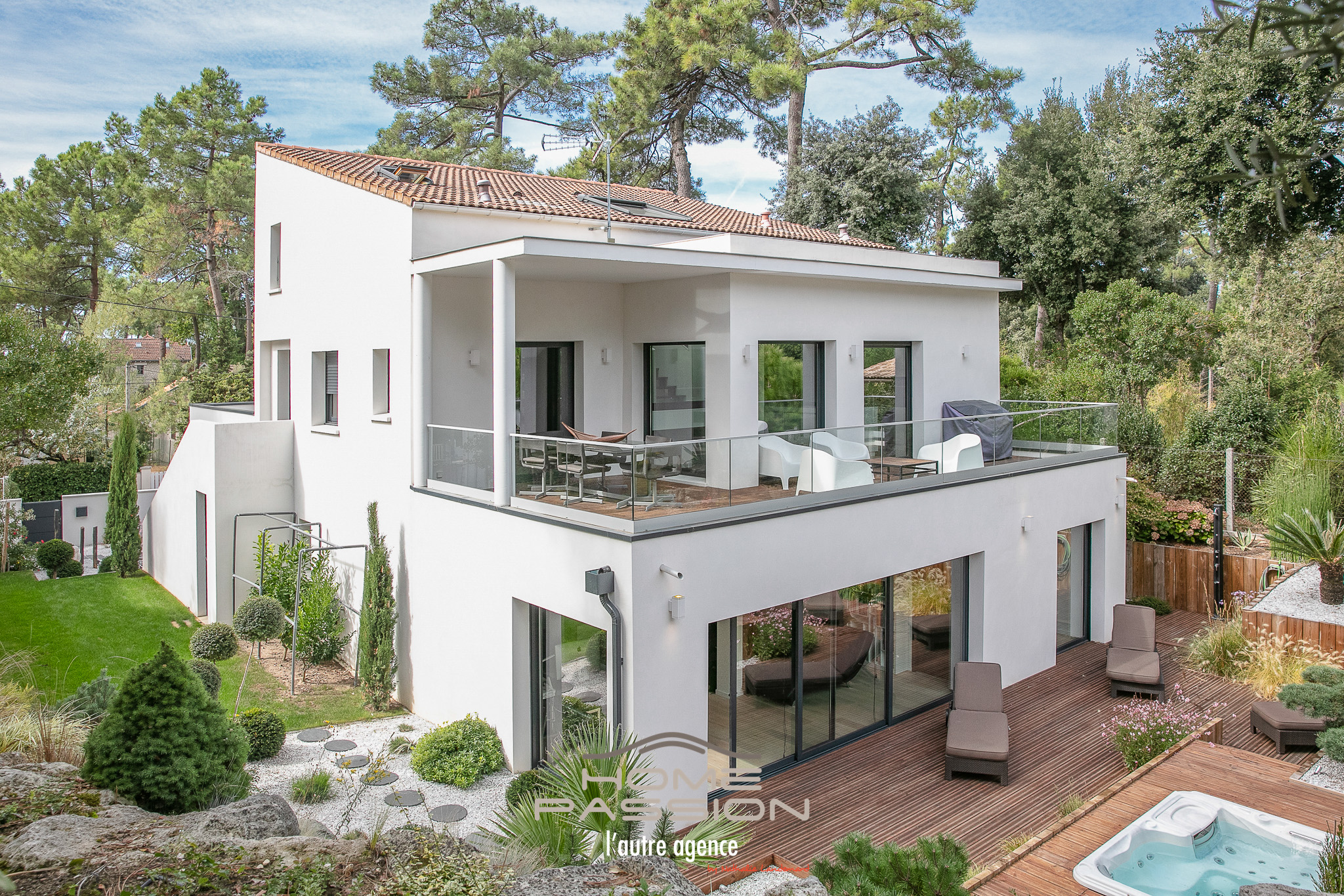 SAINT GEORGES DE DIDONNE SPLENDIDE VILLA CONTEMPORAINE - Située à 260m de la plage et à 1400m du centre ville de SAINT GEORGES DE DIDONNE, Home Passion vous présente cette splendide VILLA métamorphosée et rénovée il y a peu, développant ainsi 220m2 habitables sur un terrain clos et superbement paysager de 700m2. Afin de profiter d'une lumière traversante optimale, les volumes principaux ont trouvé leur place au premier niveau de la VILLA pour nous présenter un hall d'entrée très fonctionnel, une réception avec cheminée, une cuisine ouverte entièrement équipée, l'ensemble ouvrant sur les différentes terrasses et loggia au levant comme au couchant. WC invités également sur ce niveau. Un second salon détente TV, le bureau et les espaces nuit se répartissent les volumes du rez-de-chaussée autour d'un jardin intérieur dont une suite parentale avec dressing et salle d'eau privative, 2 autres chambres avec une salle d'eau , WC indépendant, chacune des chambres ouvrant sur jardin et/ou une terrasse. Une buanderie et un garage double complètent le rez-de-chaussée. Le 2ème niveau réserve une belle surprise par la présence de la suite propriétaire de près de 30m2 avec une magnifique salle de bain, dressing et rangements, l'ensemble ouvrant sur une terrasse à ciel ouvert de plus de 30m2 avec APERCU MER. Côté jardin, le volet paysager a été travaillé et réfléchi pour créer des espaces harmonieux autour du jacuzzi et des terrasses, jardin en espalier avec cascade selon l'humeur. Plus de détails sur le site de l'agence HOME PASSION. DONT honoraires 2.16 % à la charge de l'ACQUEREUR. DPE ancienne version : montant estimé et indexé au 15 août 2015 des dépenses annuelles d'énergie pour un usage standard : 1547 Les informations sur les risques auxquels ce bien est exposé sont disponibles sur le site Géorisques : www.georisques.gouv.fr.